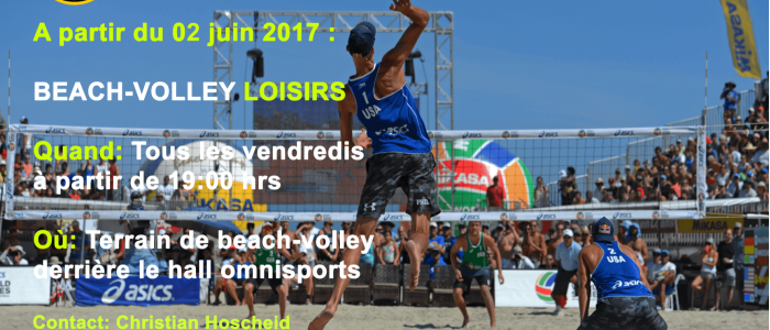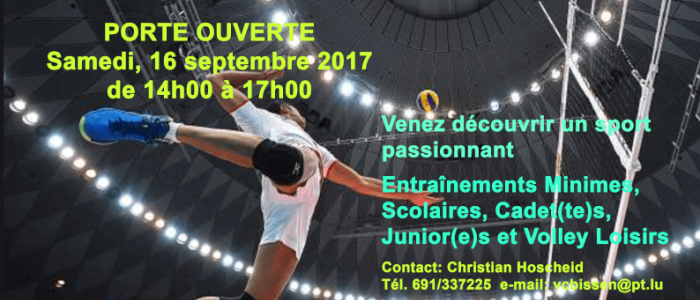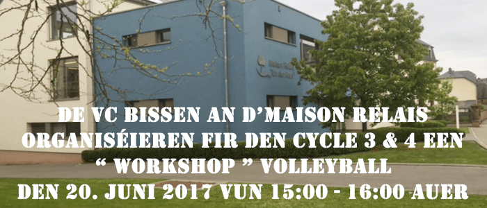 Dënschdes den 2. Mee 2017 (15:00 - 16:00 Auer) organiséiert de Volleyball Club Bissen zesummen mat der Maison Relais "Un der Attert" een "Workshop - Volleyball" zou Bissen an der Sportshal. Avis aux amateurs !!